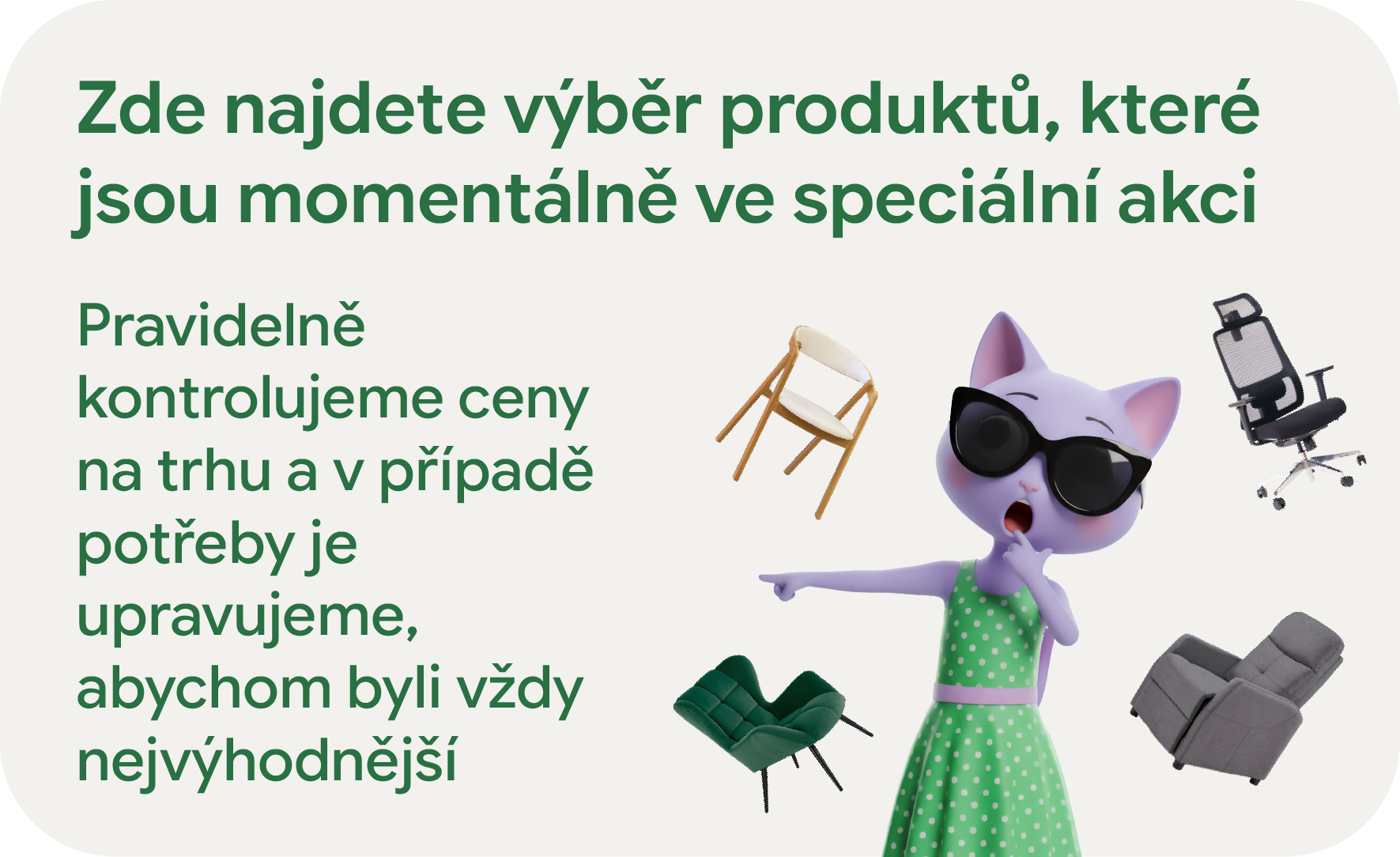 Využite túto jedinečnú príležitosť a kúpte si kvalitné stoličky a kreslá za zvýhodnené ceny. Na tejto stránke nájdete prehľad všetkých aktuálnych akcií, výpredajov a špeciálnych ponúk, ktoré pravidelne aktualizujeme. Vyberte si múdro a ušetrite bez kompromisov v kvalite.